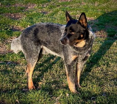 Smokey is a handsome seven year old, blue heeler / Australian cattle dog. He is large boned and has a stately conformation and beautiful color and markings. He is a family guard and protector, intelligent, loyal, and loving. He is good with cattle, horses, goats, sheep and chickens. As a blue heeler breeder we strive to keep our dogs in the best shape physically mentally and socially on the farm. He has sired several gorgeous litters of Australian Cattle dog puppies. Smokey's Blue Heeler puppies have beautiful markings and stately confirmation.
